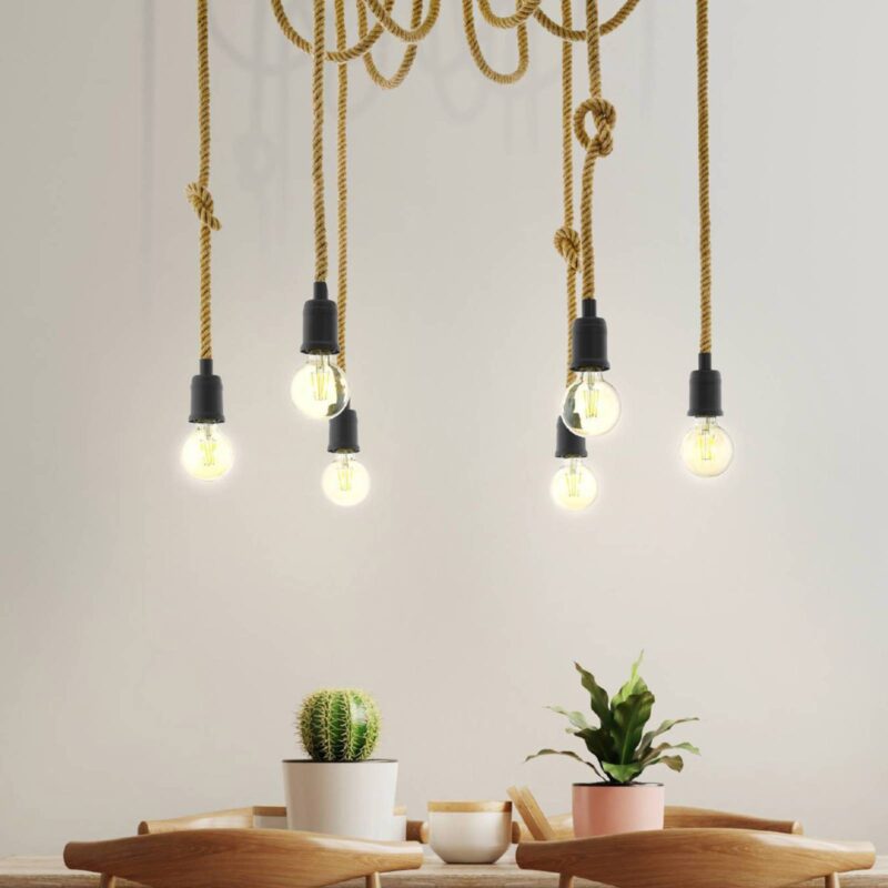 Rampside 6-žiarovkové závesné svietidlo v čiernej farbe Závesná lampa Rampside so svojimi šiestimi žiarovkami, ktoré visia zo stropu, vyzerá ako trochu iný typ lustra. Táto závesná lampa okamžite zaujme svojím jedinečným a mimoriadnym dizajnom. Obzvlášť atraktívne je lano, ktoré slúži ako nosič svetelných zdrojov a je v súlade s farbou parou potiahnutého skla tienidla. Šesť žiaroviek je každá jednotlivo zavesená na lanách zavesených na strope. Niektoré laná sú kvôli väčšej rozmanitosti zauzlené. Stropné svetlo je zvýraznením každého stropu.