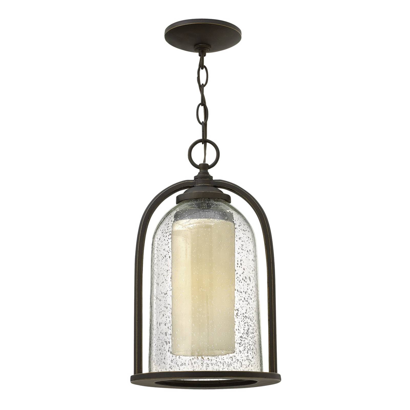 Závesná lampa Quincy pre exteriér s dvojitým tienidlom Táto atraktívne závesná lampa, ktorá bola navrhnutá na vonkajšie použitie, sa prezentuje v štýle „mladej Ameriky“. Dodáva z. B. Kryté cesty k majetku s primeraným osvetlením, ktoré zaisťuje bezpečnosť a tiež vytvára atmosférické prostredie. Rám a zavesenie sú vyrobené z odolného tlakového liateho hliníka s povrchovou úpravou s názvom „Oil Rubbed Bronze“. Priehľadné vonkajšie tienidlo má jemnú štruktúru. Valec z leptaného skla vo vnútri žiarovky funguje ako sviečka, ktorá je chránená pred vyfúknutím. Vybavené triedou ochrany IP23