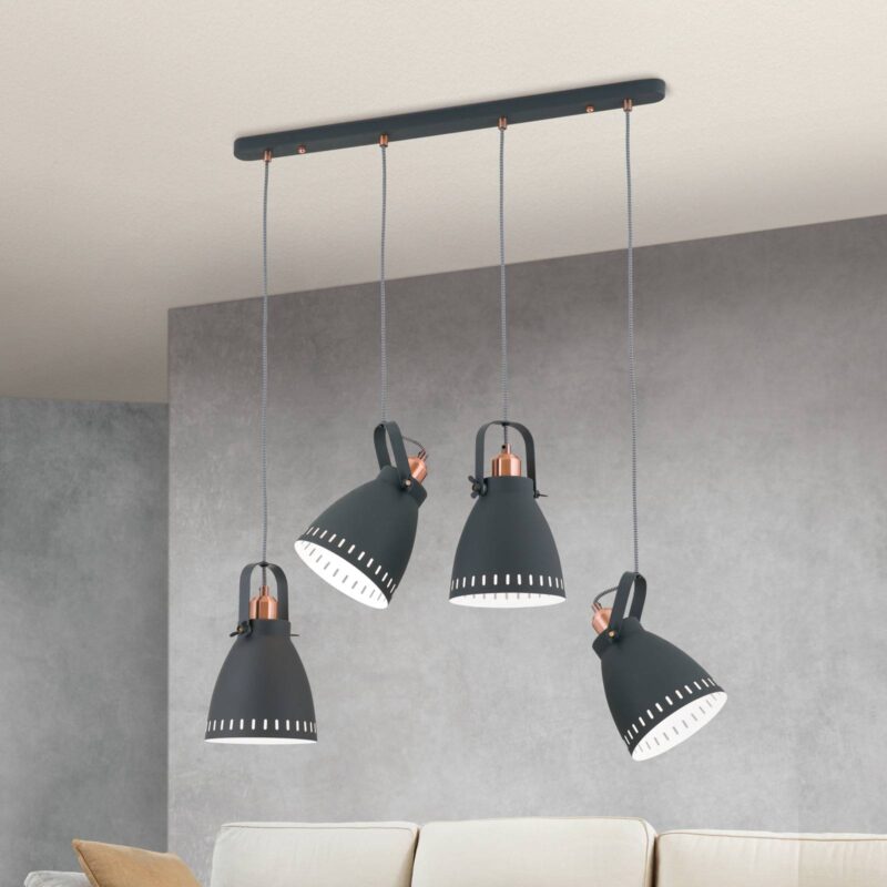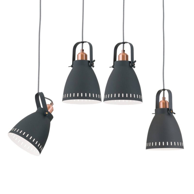 Pultový svietnik so štyrmi žiarovkami a nastaviteľnými tienidlami Tento štvorplamenný krásny závesný pult na lampu je veľmi vhodný ako diskrétny pútač očí nad jedálenským stolom alebo – ako už názov napovedá – pult. Výnimočné na ich koncepcii sú štyri tienidlá, ktoré umožňujú individuálne nastavenie uhla sklonu. tienidlo na lampu je pripevnený v príslušnej polohe pomocou dvoch krídlových skrutiek na bočnej strane konzoly. Dekoratívne prvky z medi dodávajú lampe aj priemyselný vzhľad.