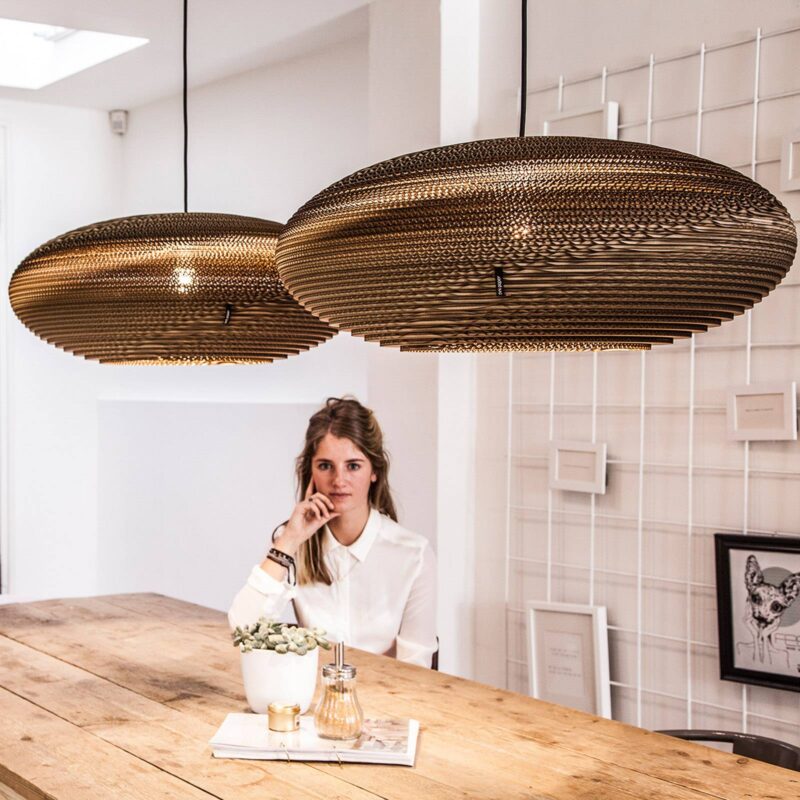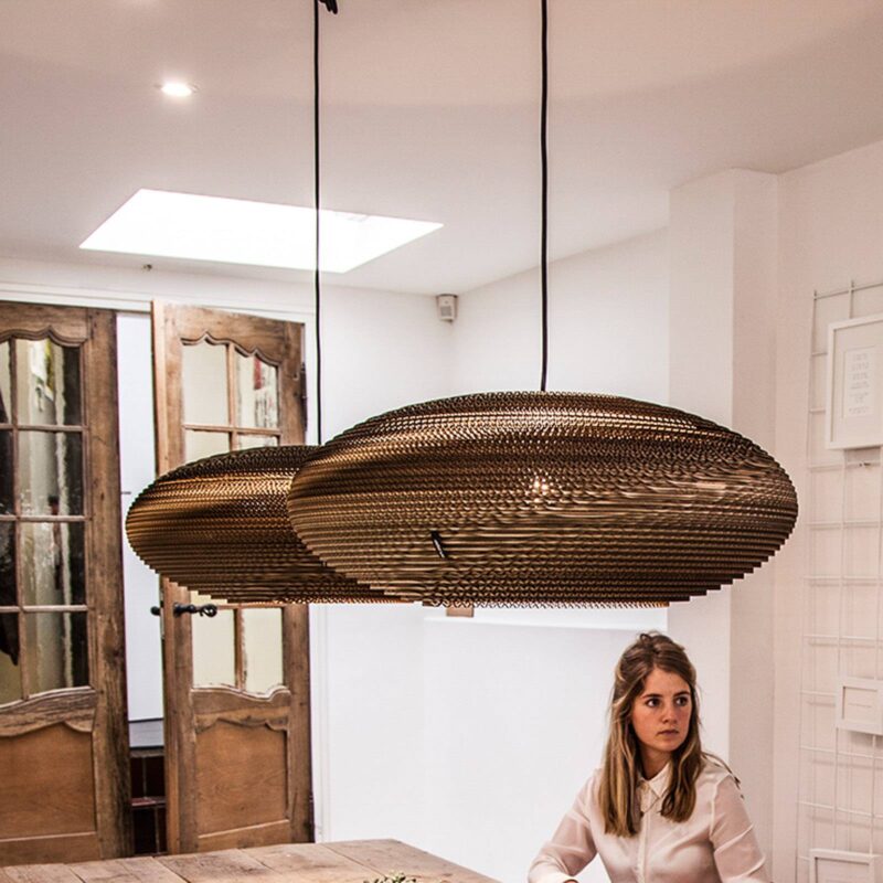 Jazzy – dizajnové závesné svietidlo s ručne vyrobeným tienidlom z lepenky Pri výrobe tejto závesnej žiarovky Jazzy sa kladie veľký dôraz na udržateľnosť. Holandský výrobca Think Paper vyrába dizajnové svetlá, ktoré sa vyznačujú nielen jedinečným charakterom, ale aj výrobným procesom, v ktorom sú všetky zvyšky, ktoré po nich zostanú, 100% recyklovateľné. Plochý tienidlo na lampu oválneho tvaru prívesného svietidla Jazzy bol vyrobený samonosne z pásov lepenky. Kartónové pásy boli usporiadané ručne s prihliadnutím na obvodovú, rovnú a harmonickú nuanciu. Pásy sú lepené úplne biologicky odbúrateľným lepidlom. Jemné medzery umožňujú presvitanie svetla žiarovky, čo skutočne prináša jedinečný tienidlo na lampu . Ako samostatná lampa alebo v kombinácii s niekoľkými v rovnakých alebo rôznych veľkostiach môže séria závesných žiaroviek Jazzy osvetliť stôl alebo vytvoriť veľmi špeciálne usporiadanie svetla, ktoré nie je len osvetlením, ale aj dekoráciou. Poznámka: Lampa sa vyrába na objednávku; dodacia lehota je až šesť týždňov.