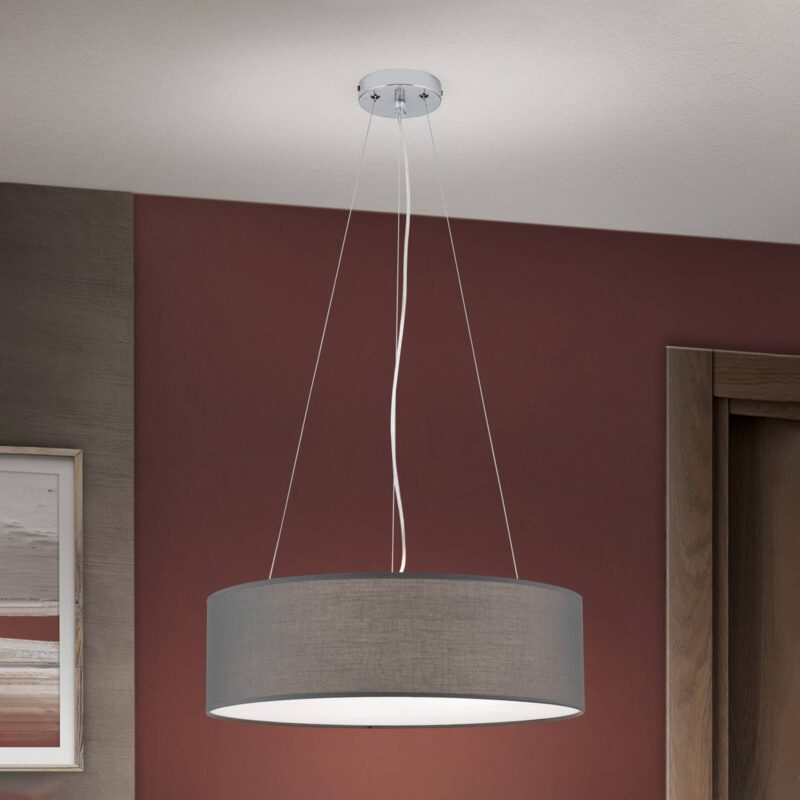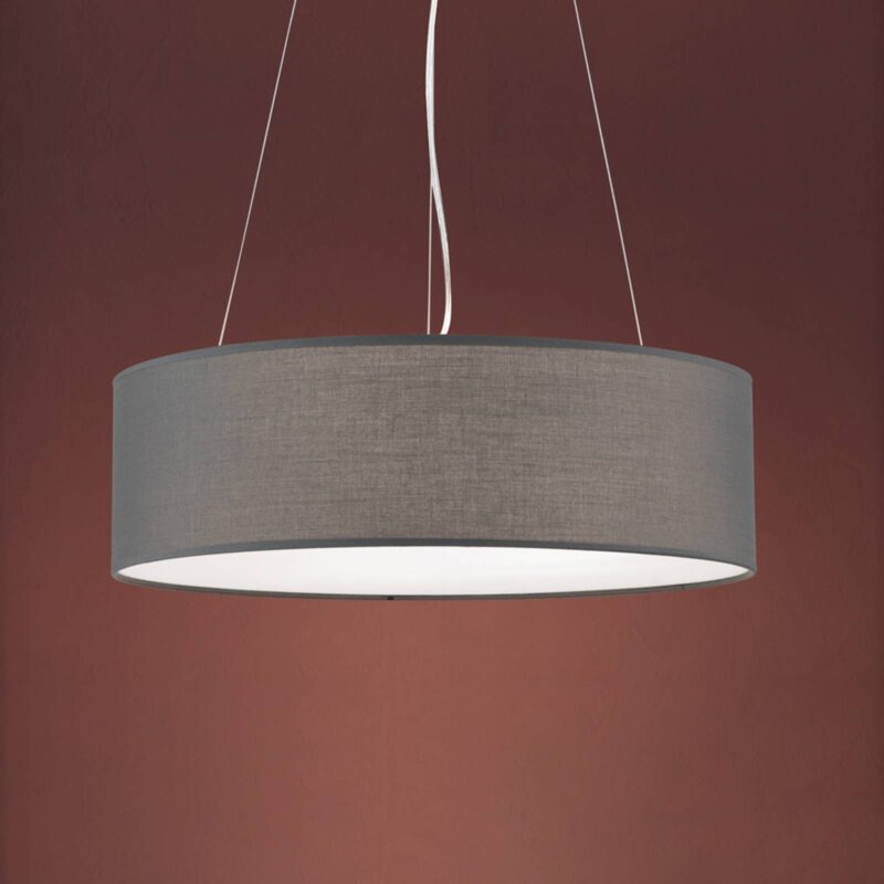 Závesná lampa Ufo so sivým látkovým tienidlom