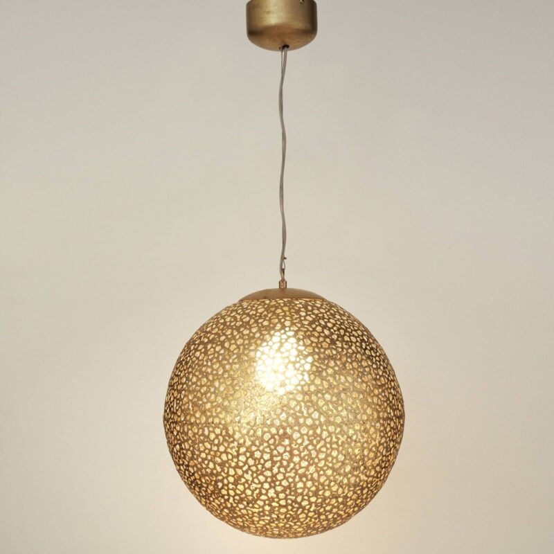 Neobvyklé závesné svietidlo UTOPISTICO, ktoré púta pozornosť v každej miestnosti Závesná lampa UTOPISTICO je skutočným pútačom pozornosti, ktorý je možné použiť na dizajn a osvetlenie najrôznejších miestností: veľké sférické telo žiarovky vyrobené zo zlatého železa má malý vzor, aby svetlo mohlo bez prekážok preniknúť von. Vzor tiež vytvára v oblasti svetelné efekty, ktoré sa určite oplatí vidieť.