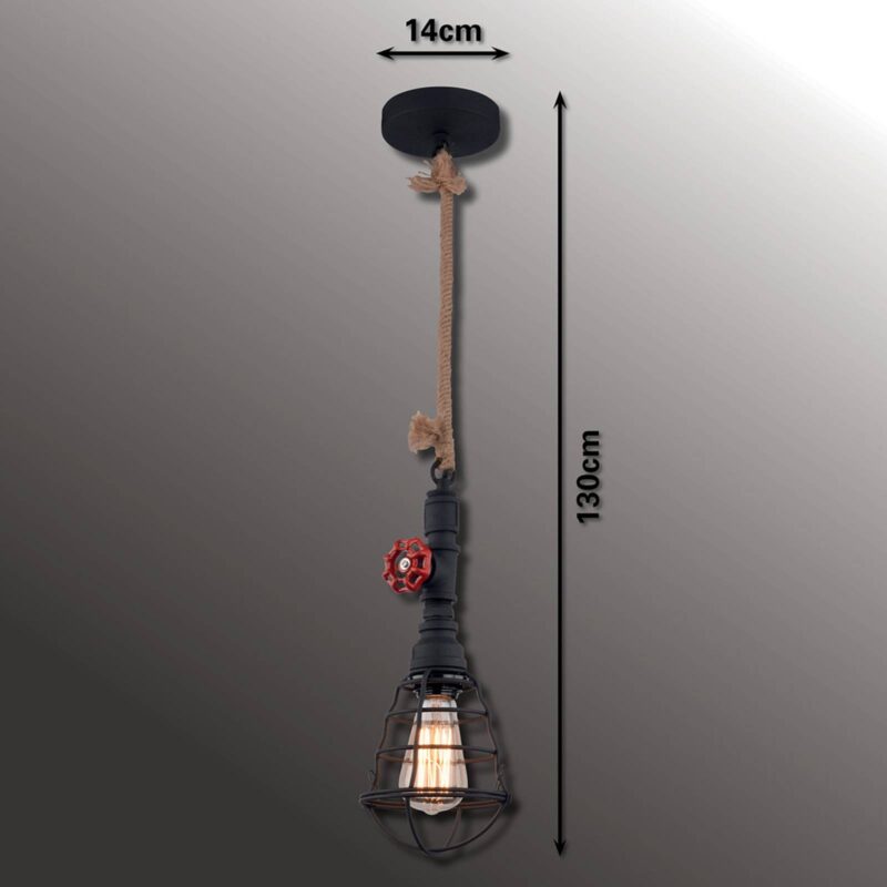 Trendy priemyselná závesná lampa so zavesením na konopnom laneTáto závesná lampa zaujme svojím priemyselným dizajnom. Záves tvorí hrubé konopné lano, zatiaľ čo tienidlo a stropný držiak sú vyrobené z kovu. Malý otočný ventil v červenej farbe sa postará o osobitý pútavý a ešte originálnejší vzhľad. Starostlivo treba vybrať aj žiarovku, ktorá je ochranne obklopená pevnou kovovou klietkou; ozdobná žiarovka v tvare žiarovky najlepšie dotvára industriálny dizajn (pozri príslušenstvo).