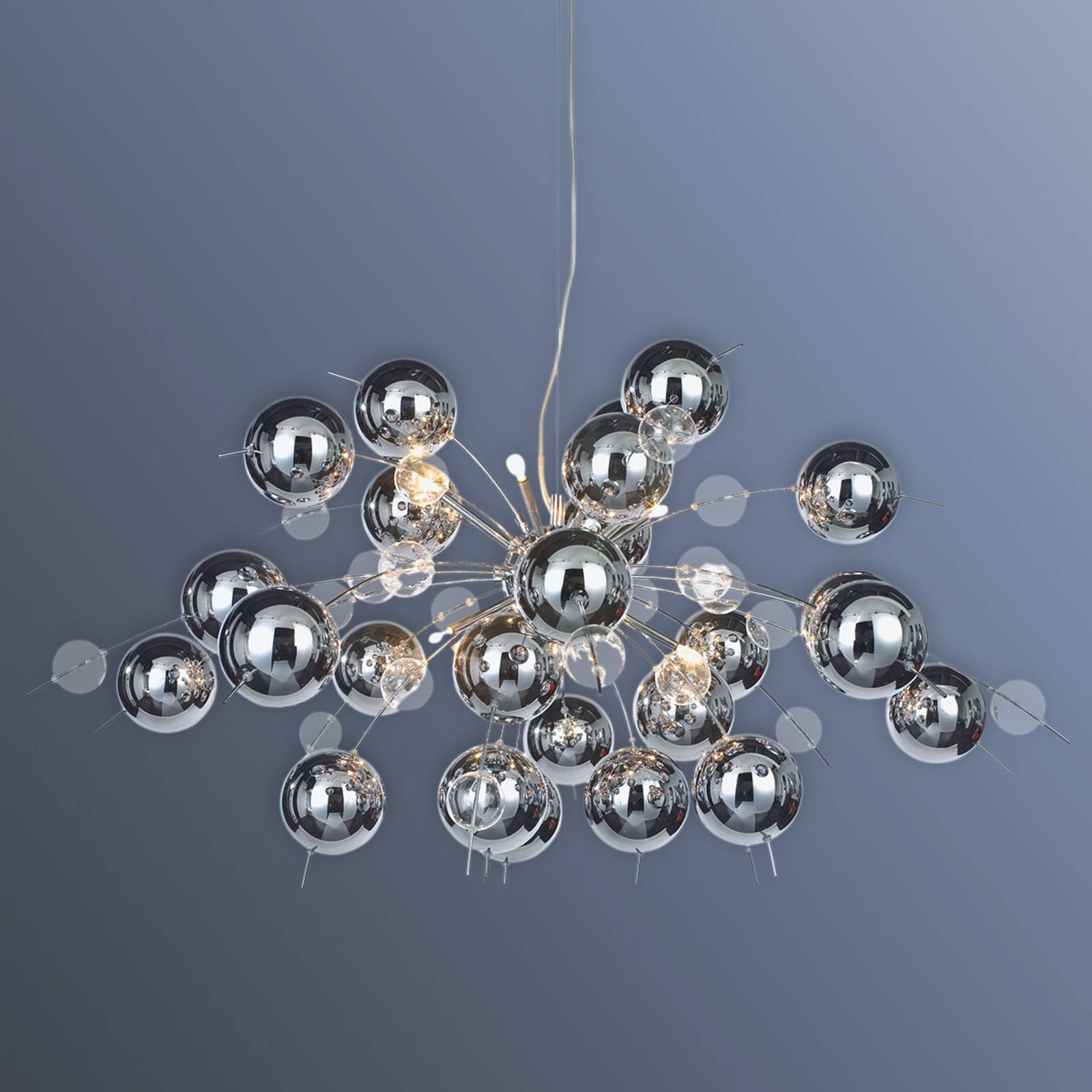 Závesné svietidlo Wakusei s pochrómovanými sklenenými guľami Závesná lampa Wakusei upúta veľmi svojskou, veľmi moderne vyzerajúcou eleganciou. Existuje nespočetné množstvo menších sklenených gúľ, ktoré spolu tvoria tienidlo na lampu tejto závesnej lampy. Niektoré z nich sú číre, iné s lesklým chrómovým povrchom. Malé halogénové žiarovky sú umiestnené v medzerách a vytvárajú obzvlášť efektívny svetelný obraz, pretože sú tu početné odlesky, a teda krásna iskra.