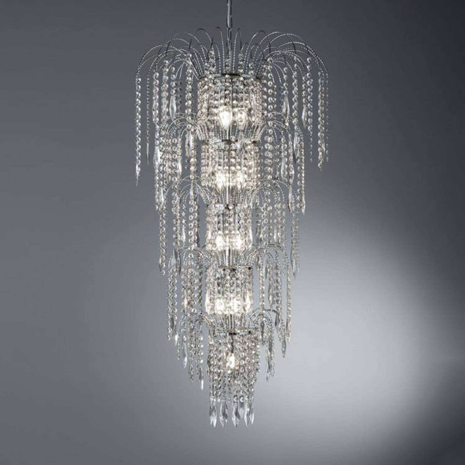 Pôsobivé umenie svetla – krištáľová závesná lampa WATERFALL Popri tejto závesnej lampe nemôžete len tak prejsť: V impozantnej výške 112 cm je lampa WATERFALL ozdobená množstvom krištáľov – niekedy podlhovastými, inokedy okrúhlymi. Ramená v chrómovom vzhľade sa v oblúku vypínajú jemne smerom nadol, čo v skutočnosti prebúdza spojenie so šumiacim vodopádom. Celkom 13 žiaroviek, ktoré vyžarujú zvnútra, rozžiari krištále, takže je celá miestnosť zahalená do žiarivých odrazov svetla. Najmä v priestranných vstupných halách alebo sálach nájde závesná lampa vhodné miesto a určite tam zaistí nadšenie.