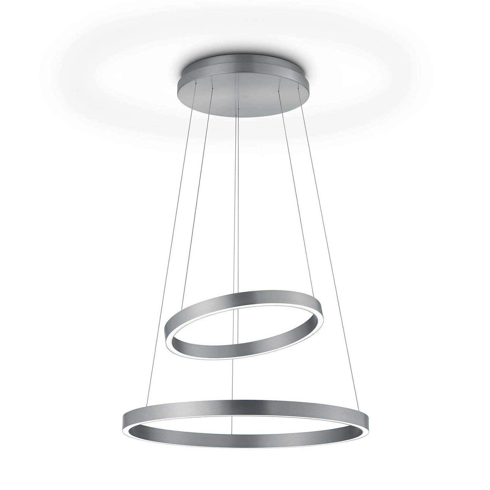 Závesné LED svietidlo Lora-P ovládané gestami s vyžarovaním svetla smerom dole a hore Moderné závesné svietidlo Lora-P sa skladá z dvoch prstencov rôznych veľkostí, ktoré sú prevádzkované teplými bielymi LED diódami. Impozantný osvetľovací objekt je zvýraznením každého jedálenského stola. Jemná niklová farba kovu sa dá kombinovať mnohými spôsobmi. Za nadčasovým dizajnom stojí najnovšia technológia. Lora-P sa dá zapnúť a vypnúť jednoduchým pohybom ruky. Funkcia stmievania sa aktivuje držaním ruky v príslušnej oblasti snímača. Vďaka pamäťovej funkcii svieti lampa pri opätovnom zapnutí vždy naposledy zvoleným jasom. Dva svetelné krúžky sú vybavené LED diódami na vrchnej a spodnej časti. Každá strana je vybavená senzorom, ktorý umožňuje ich individuálne ovládanie. Lora-P má tiež plynule výškovo nastaviteľné zavesenie (73-171 cm). Krúžky môžu byť tiež usporiadané pod rôznymi uhlami pomocou jednotlivých závesov zdvihu. Ďalším šikovným detailom od výrobcu je magnetický držiak v stropnom kryte, ktorý úhľadne zakrýva všetky skrutky.