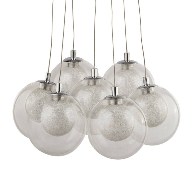 Sedem žiarovkové LED závesné svietidlo Cluster s dvojitými sklenenými tienidlami Táto závesná lampa sa ukazuje ako zväzok svetla, ktorý na jednej strane vyniká optickou prítomnosťou prostredníctvom dekoratívneho dvojtieňového vzhľadu a na druhej strane veľmi atmosférickým svetelným obrazom, s ktorým je možné pohodlne navrhnúť každý obývací priestor. Sedem samostatných svetiel visí zviazaných dole z chrómovej stropnej konzoly. Vonkajšie tienidlo na lampu pozostáva z čírej sklenenej gule, ktorej vnútro je vybavené menšou bielou matnou sklenenou guľou a zdrojom bielej teplej bielej LED. Výšku zavesenia je možné meniť iba počas montáže.
