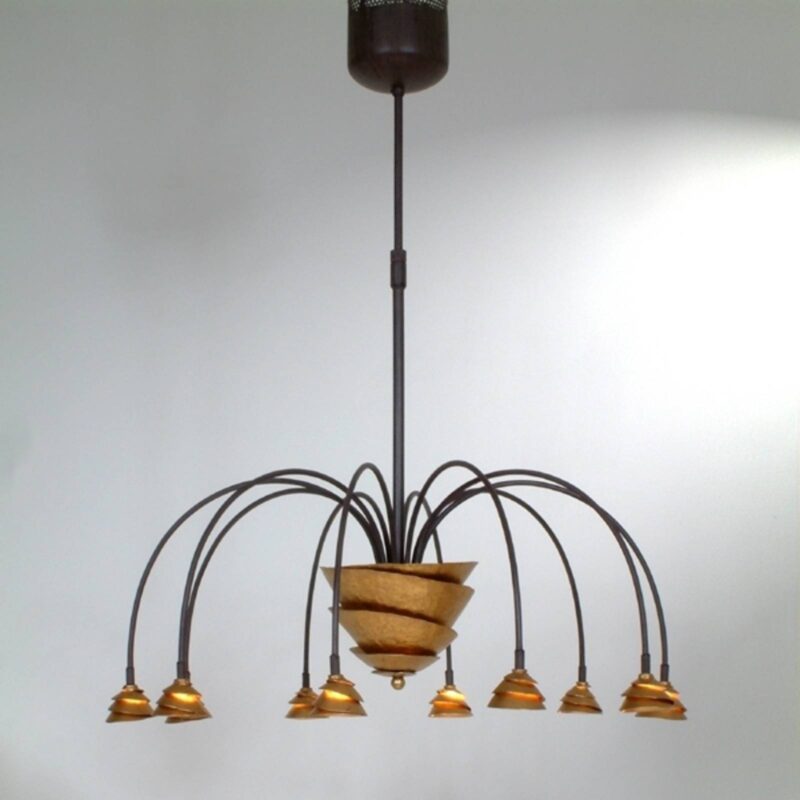 Výškovo nastaviteľné závesné svietidlo LED Fontaine zaujme osobitým vzhľadomUmiestnenie železných prvkov sa v závesnom svietidle LED Fontaine javí ako fontána, počnúc centrálne usporiadanou konštrukciou v zlatej farbe, ktorá sa opäť nachádza v štýlových tienidlách. Kovové tienidlá – prepracované pri výrobe – štýlovo obklopujú svetelné zdroje a otvárajú sa, aby lámali svetlo v zlatom lesku. V malých vonkajších tienidlách, ako aj v centrálnom veľkom kovovom prvku si svetlo štýlovo razí cestu cez kovové špirály.