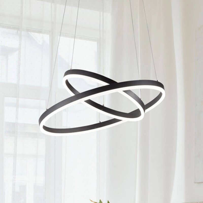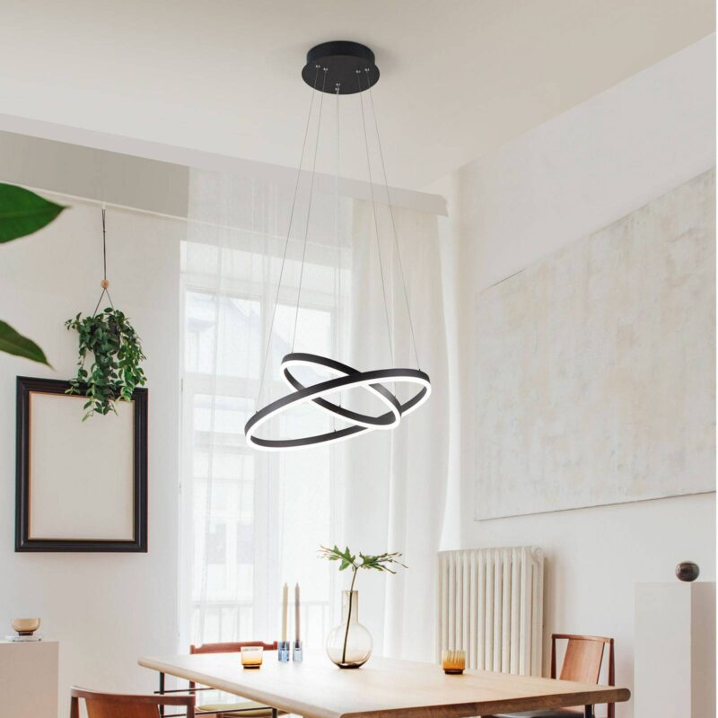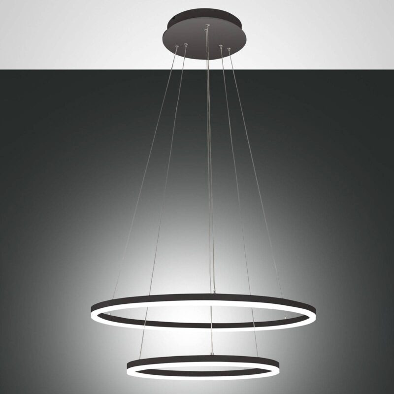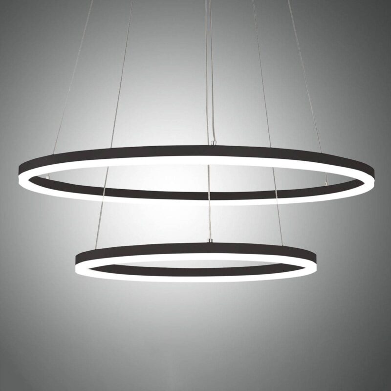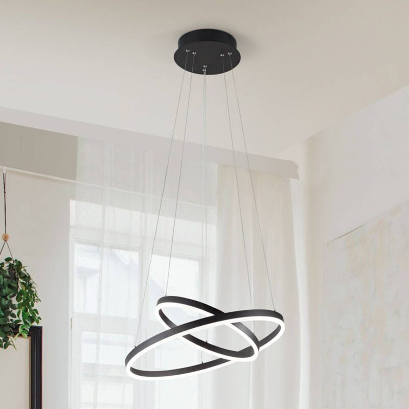 Závesné svietidlo LED Giotto s dvoma lampami v čiernej farbe Z produkcie talianskeho výrobcu svietidiel Fabas Luce pochádza závesné svietidlo LED Giotto s dvoma svetelnými prvkami v tvare prstenca. Kruhová lampa je elegantná a tvarovaná. Vďaka svojmu modernému dizajnu je ozdobou každého interiéru a zároveň ponúka optimálne osvetlenie vďaka stmievateľným LED diódam. Svietidlo sa skladá z dvoch rôzne veľkých prvkov svietidla, ktoré sú zavesené v rôznych výškach, aby vytvorili harmonický celkový vzhľad. Obe sú zasadené do tenkého kovového rámu v elegantnej čiernej farbe. LED diódy nainštalované v ráme svietia teplou bielou farbou. Svetlo je možné stlmiť a vytvoriť tak vhodnú atmosféru.
