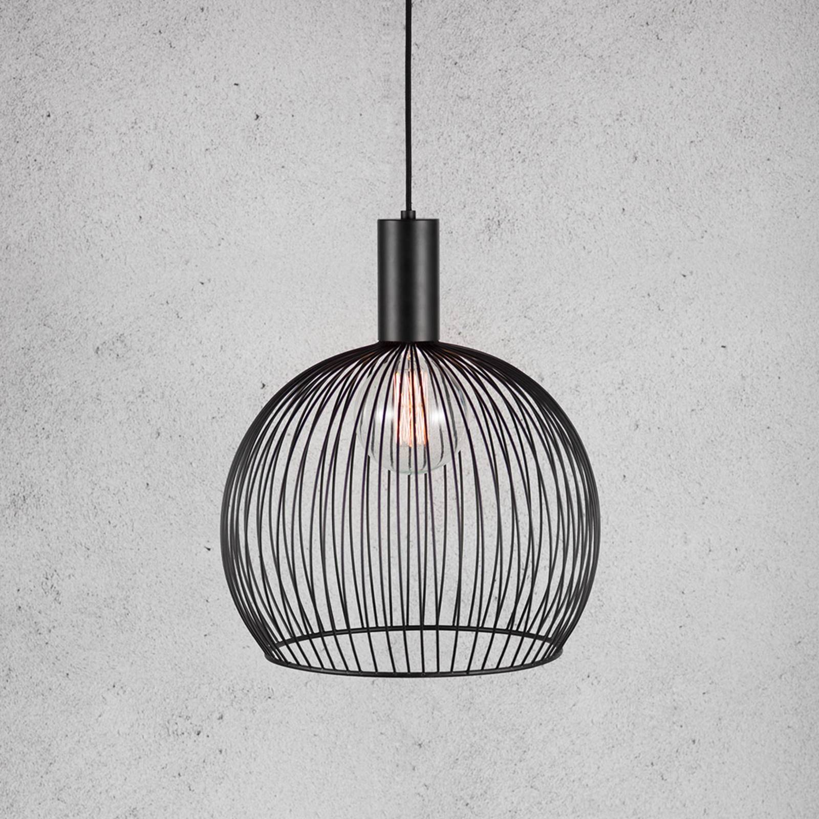 Závesné svietidlo Aver s tienidlom na lampu Svetlo vyžarované závesným svietidlom Aver preniká bez prekážok von medzi tyčami, ktoré vytvárajú otvorenú guľu. Žiarovka je voľne viditeľná; s matnou kvapkovitou žiarovkou môže Aver slúžiť ako primárny zdroj svetla v miestnosti, zatiaľ čo závesné svietidlo s čírou guľovou a rustikálnou žiarovkou má navyše dekoratívny účinok. Celkom čierne závesné svietidlo sa okrem tienidla na lampu skladá z valca, ktorý spája kábel a tienidlo na lampu a slúži ako objímka žiarovky.