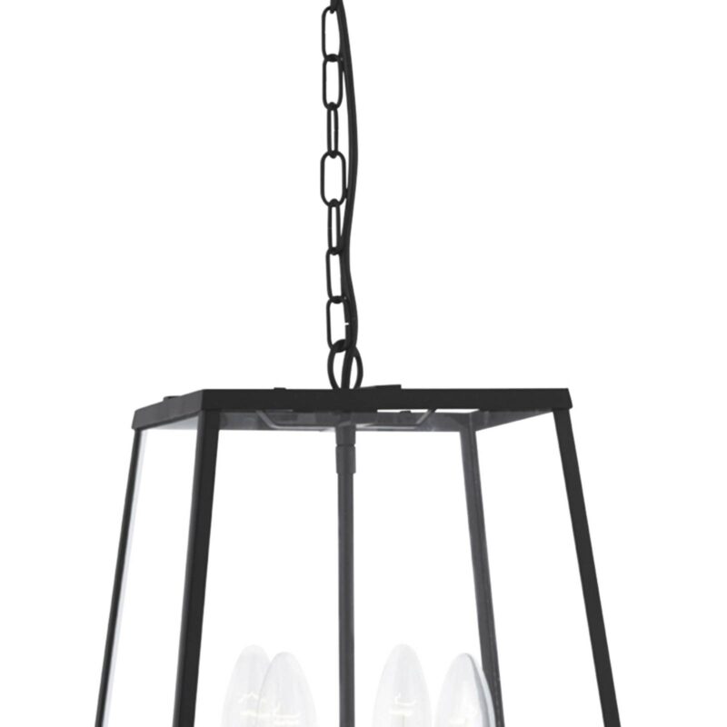 Závesná lampa Lantern so starožitným nádychom – štvorplameňová Závesná lampa Lantern upevnená na retiazke vyžaruje jemný starožitný nádych. Svietidlo je vyrobené z čiernej lakovanej mäkkej ocele, jednoduché tienidlo v tvare svietidla je osadené čírymi sklenenými tabuľami. Vo vnútri svietidla tak zostáva voľný výhľad na štyri objímky E14, do ktorých možno vložiť všetky druhy žiaroviek (aj LED). Svetlo osvetľuje okolie zo všetkých strán. Dekoratívny zdroj svetla do obývacích izieb a chodieb, ktorý je ideálny ako základné osvetlenie.