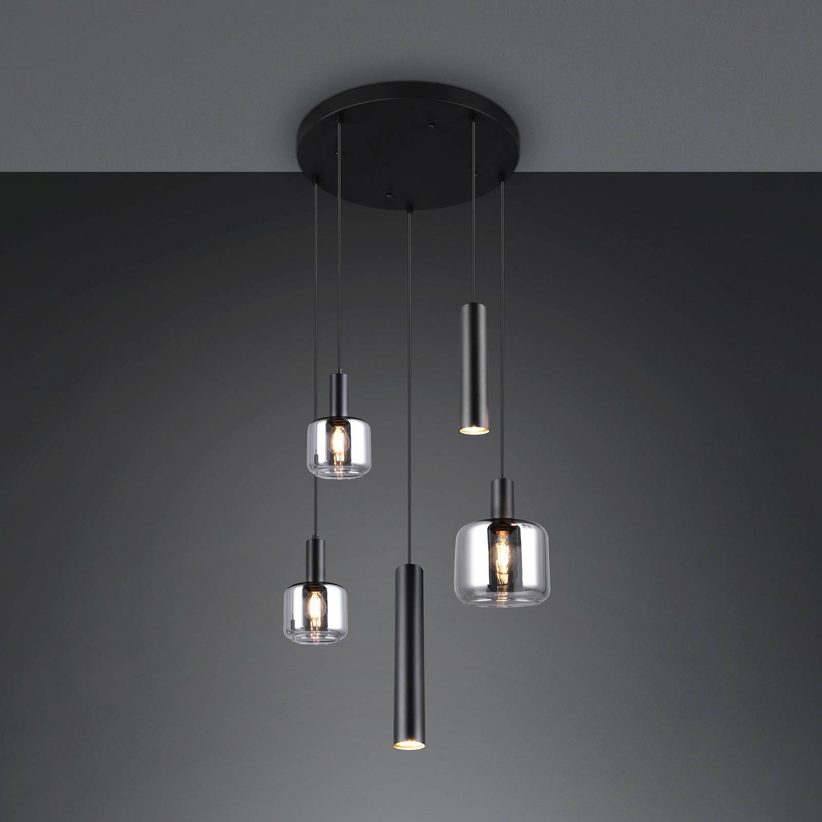 Päťsvetelné závesné svietidlo Mataro – sklo a kov v chrómovej a čiernej farbe Mataro je moderné závesné svietidlo s piatimi svetelnými bodmi, ktoré možno použiť ako centrálny zdroj svetla v miestnosti. Päť príveskov je umiestnených pod čiernym kruhovým vrchlíkom. Dva čierne kovové valce sú vybavené objímkou GU10; k dispozícii sú aj tri okrúhle tienidlá z chrómového tónovaného skla, z ktorých dve majú objímku E14 a jedno s objímkou E27.
