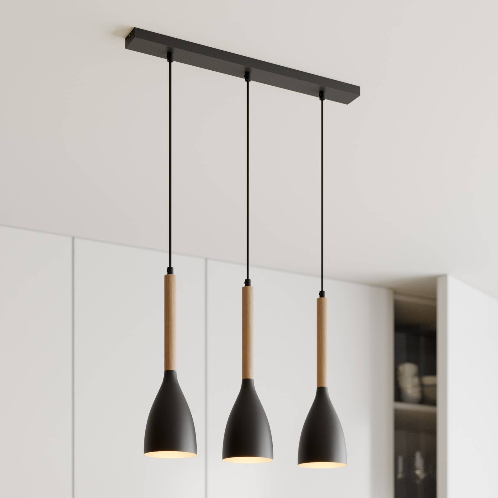 Závesné svietidlo Muza 3-pl. dlhé čierne/svetlé drevo