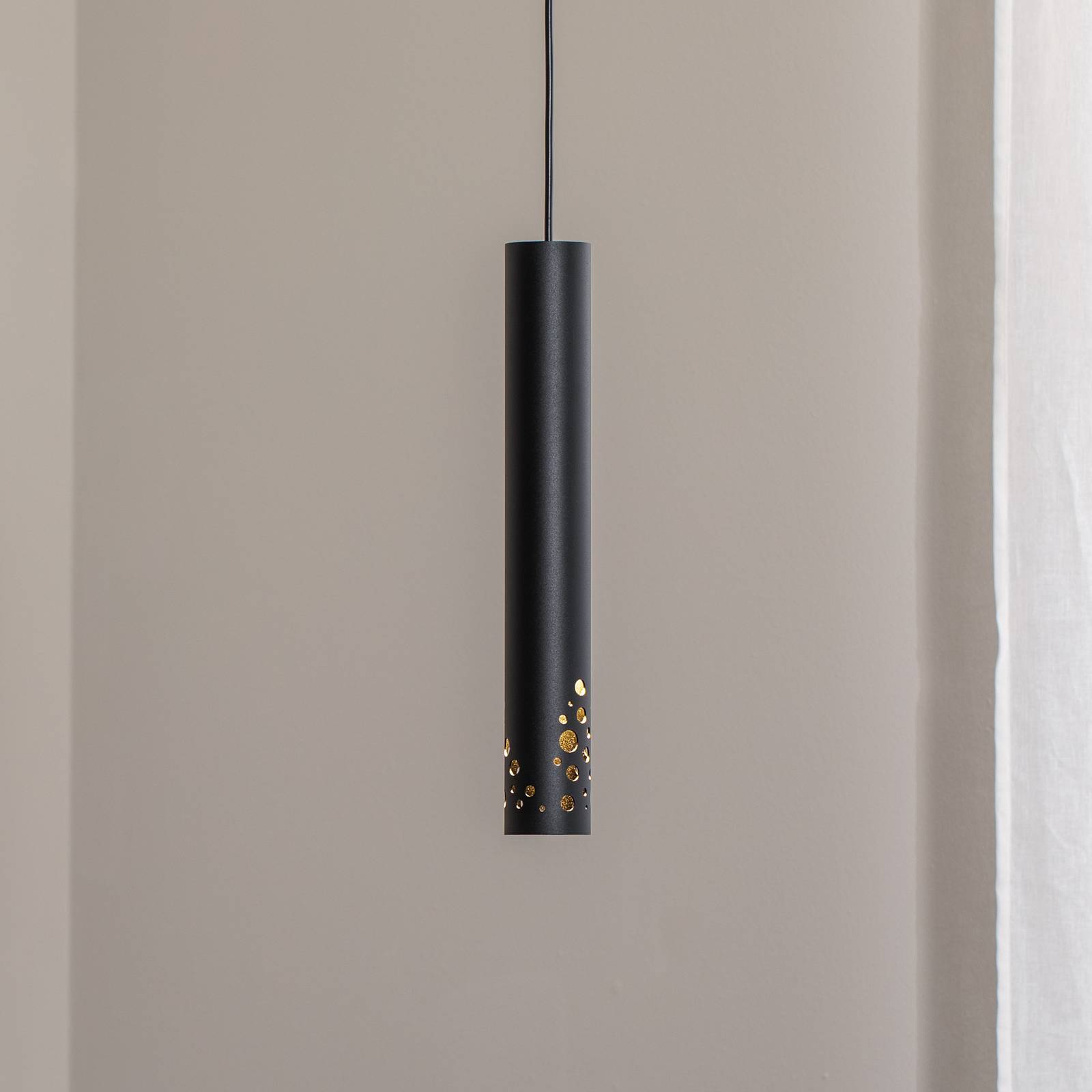 Umelecké osvetlenie pre váš domov: závesné svietidlo Tibia Závesné svietidlo Tibia zaujme svojím valcovitým, štíhlym tienidlom z ocele, ktoré má v spodnej časti nápadný perforovaný vzor. Ten vytvára mimoriadne krásny svetelný efekt. Závesné svietidlo Tibia je viac než len zdroj svetla; je to dizajnový prvok, ktorý výrazne ovplyvňuje atmosféru miestnosti. V tienidle je zabudovaná objímka GU10, ktorú možno osadiť svetelným zdrojom podľa vlastného výberu (max. 8 W LED) – vyrobené v Európe
