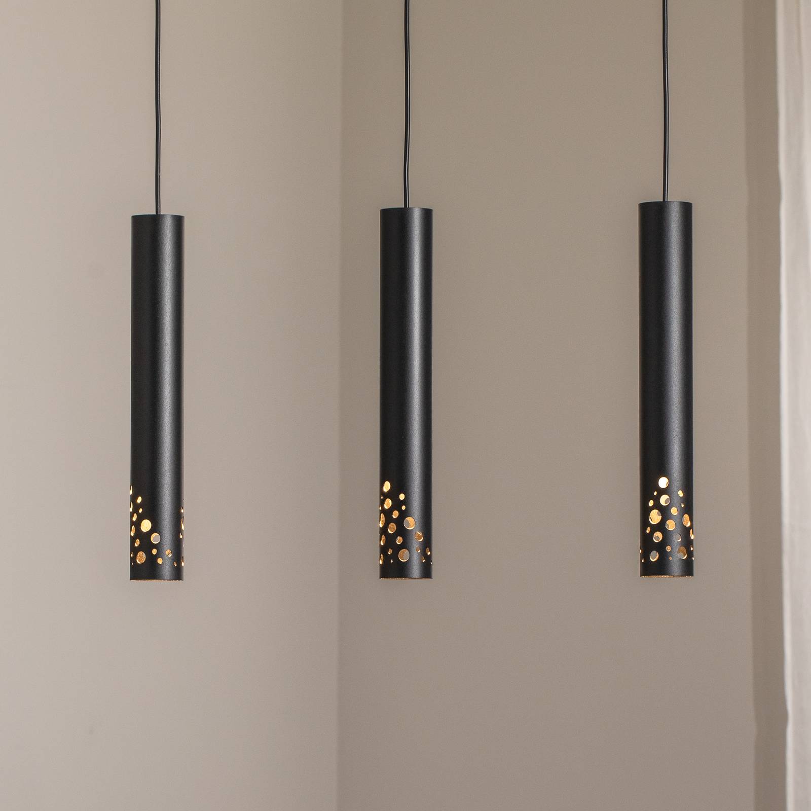 Trojsvetelné závesné svietidlo Tibia v čiernej farbe Trojsvetelné závesné svietidlo Tibia zaujme valcovitým tvarom, štíhlymi oceľovými tienidlami, ktoré majú v spodnej časti efektný perforovaný vzor. Tieto perforácie v tienidlách vytvárajú mimoriadne krásny svetelný efekt. Závesné svietidlo Tibia je viac než len zdroj svetla; je to dizajnový prvok, ktorý výrazne ovplyvňuje atmosféru miestnosti. Do tienidiel boli nainštalované objímky GU10, ktoré možno osadiť svetelnými zdrojmi podľa vlastného výberu (max. 8 W LED) – vyrobené v Európe