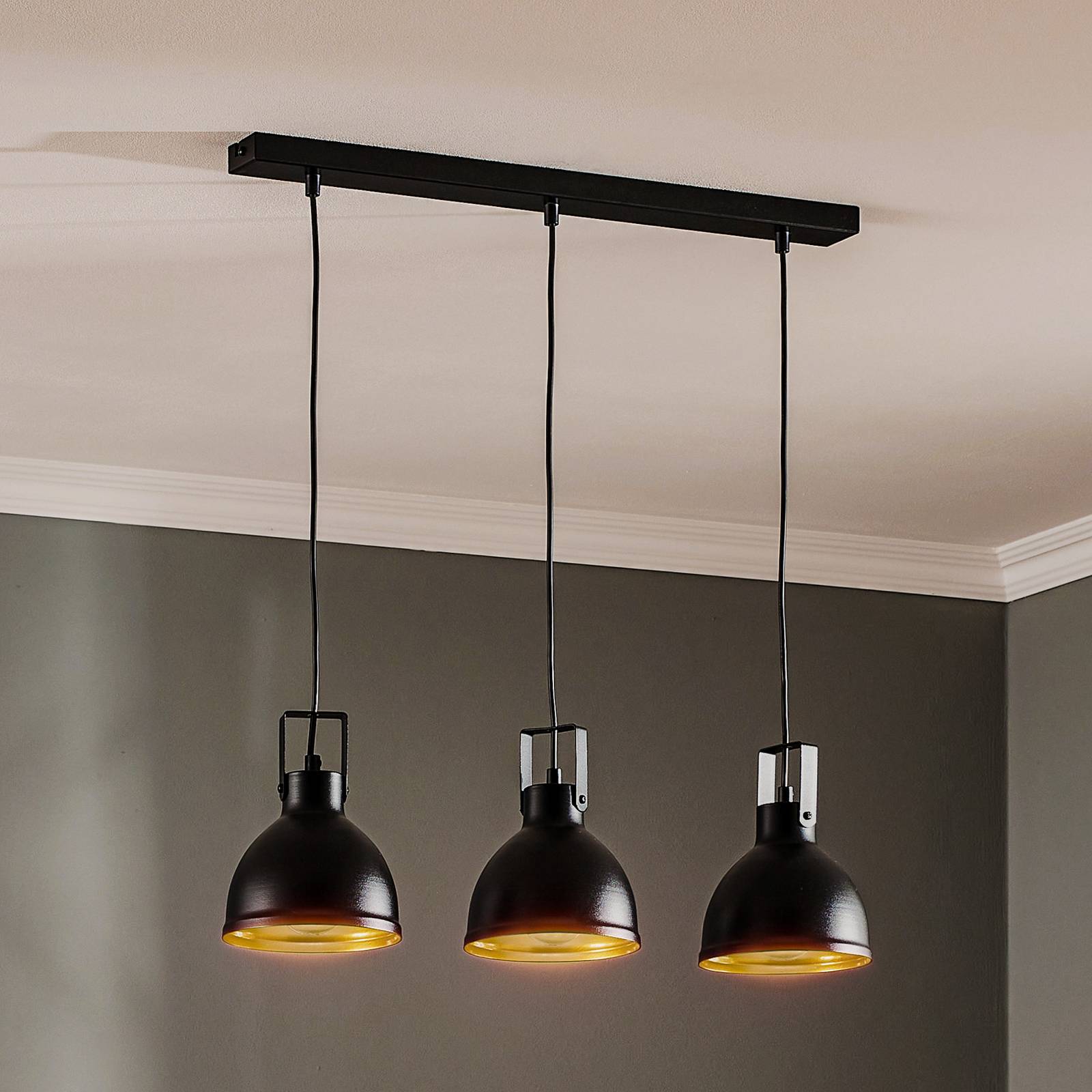 Závesné svietidlo Trial, 3-pl. lineárne, čierne/zlaté