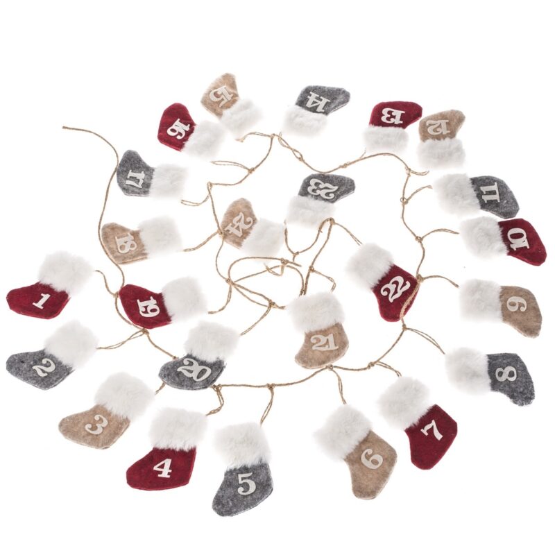 Krásny a praktický adventný kalendár má 24 snímateľných textilných vrecúšok, ktoré môžete naplniť podľa vlastných predstáv sladkosťami, malými hračkami a inými drobnosťami, ktoré potešia vaše deti. Na textilný povrázok ich ľahko pripevníte štipcami, ktoré sú súčasťou balenia. veľkosť vrecúška: 8 x 10 cm (š x v)