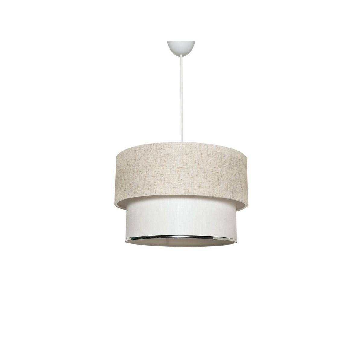 Závesné svietidlo s dvojvrstvovým tienidlom v prírodných krémových tónoch je ideálnou voľbou pre tých, ktorí hľadajú jemné, neutrálne osvetlenie s čistým dizajnom. Kombinácia svetlej hornej časti s ľahkou textúrou a hladkej bielej spodnej vrstvy pôsobí harmonicky a elegantne. Štýl dopĺňa tenký kovovo lesklý lem na spodnom okraji, ktorý dodáva celku decentný moderný akcent. Svietidlo sa skvele hodí do svetlých a vzdušných interiérov v štýle škandi, modern classic alebo minimalistickom duchu.