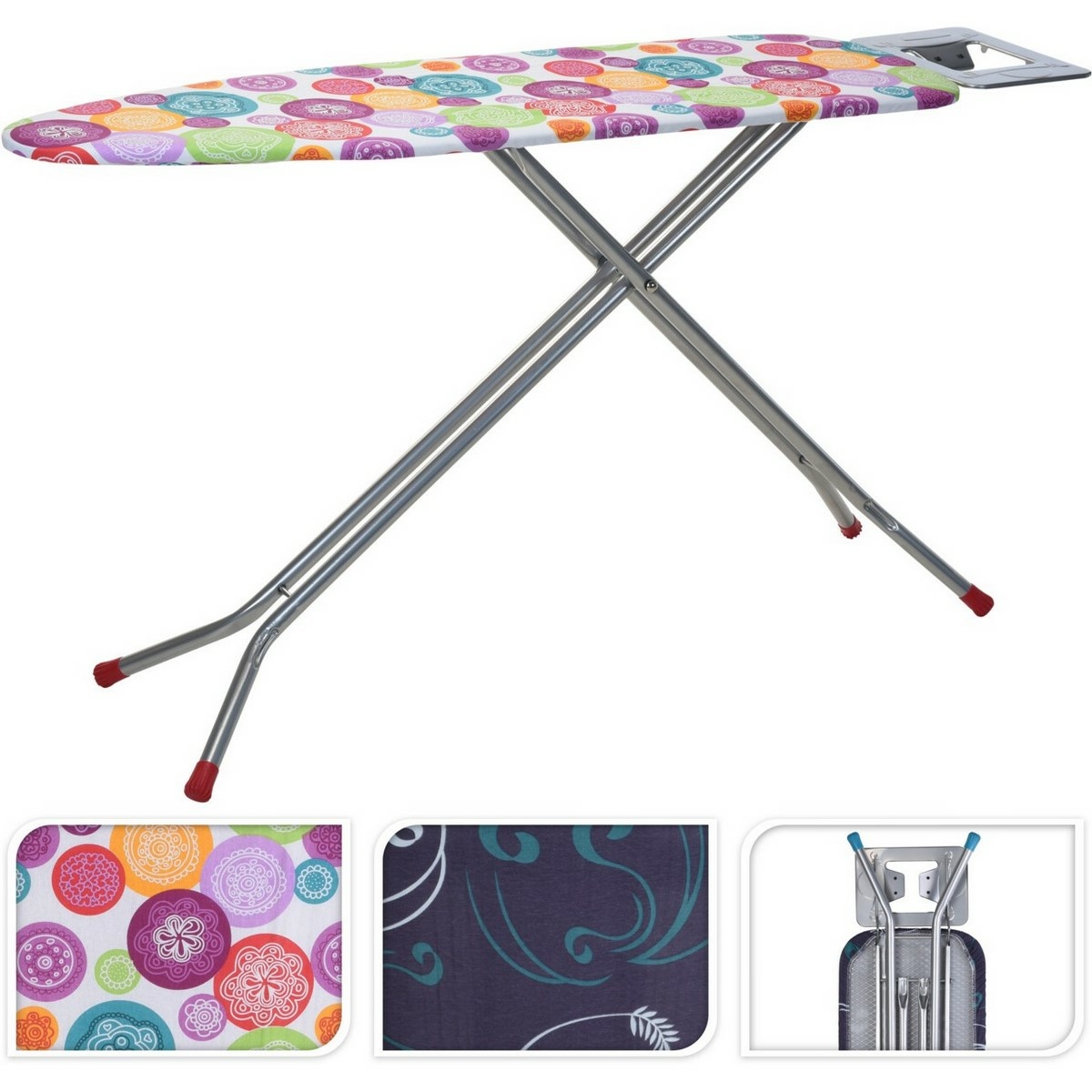 Súčasťou je poťah s atraktívnym dizajnom farebných kruhov. Doska je ľahko skladovateľná vďaka skladaciemu mechanizmu a jeho ľahká konštrukcia umožňuje ľahkú manipuláciu. Žehliaca doska kombinuje funkčnosť, stabilitu a moderný dizajn, čo z nej robí perfektný doplnok do každej domácnosti.