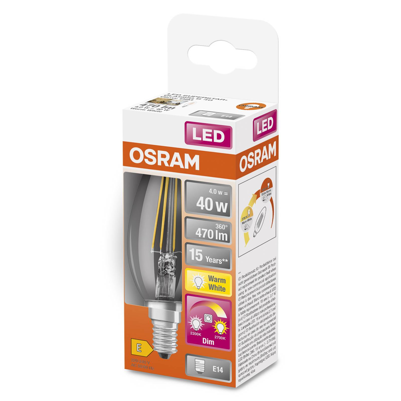 E14 4W LED žiarovka Glow Dim, číra Táto LED žiarovka v tvare sviečky s čírym sklom a efektom GLOWdim sa dá stmievať pomocou mnohých komerčne dostupných stmievačov a počas stmievania mení farbu svetla z 2 700 K na veľmi teplú 2 200 K.