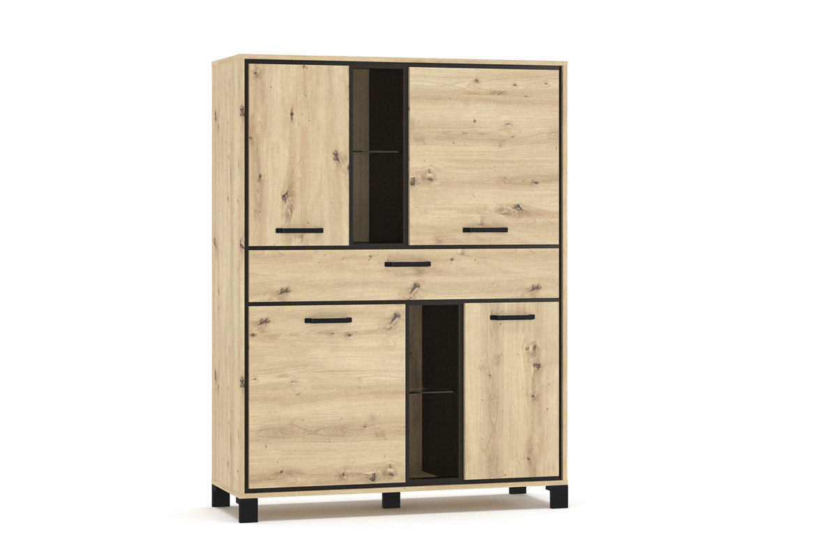 Obývací sektor ZOLNA s atmosférou industriálneho štýlu tvorí nábytok plný zaujímavých detailov. V ponuke je v nadčasovom a štýlovom farebnom prevedením dub artisan s kontrastným orámovaním farby wenge.Súčasťou sektora je 4-dverová komoda ZOLNA s jedným šuplíkom. Za otváravými dvierkami sa nachádza jedna polica. Medzi dvierkami sa nachádzajú aj sklenené police, kde si môžete vystaviť spomienkové predmety. Komoda je vyrobená z veľmi kvalitného LTD materiálu, ktorý sa ľahko udržiava.Dvierka na komode majú elegantné úchytky čiernej farby.Komoda má výrazné a štýlové nožičky čiernej farby. Rozmery:- šírka: 117,4 cm,- výška: 157,6 cm,- hĺbka: 41,2 cm.Dodávame v demonte, pričom montáž je veľmi jednoduchá.