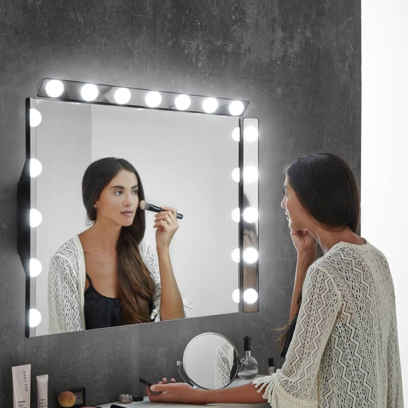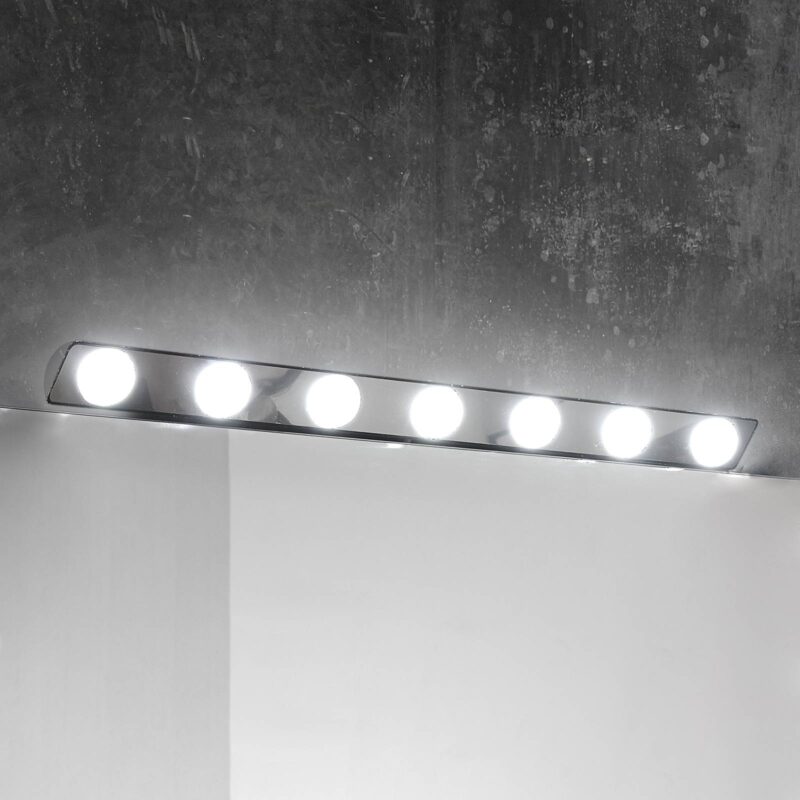LED zrkadlové svietidlo Hollywood s variabilnými možnosťami montáže LED zrkadlové svietidlo Hollywood pozostáva z pásu s elegantným lesklým chrómovým povrchom. Ten je vybavený siedmimi okrúhlymi difúzormi, v ktorých sú umiestnené LED diódy denného bieleho svetla. Vďaka flexibilnej montáži možno svietidlo Hollywood použiť v horizontálnej alebo vertikálnej polohe, podľa potreby ako zrkadlové svietidlo, nábytkové svietidlo alebo nástenné svietidlo. Svietidlo sa dodáva s krabicou na pripojenie na stenu vrátane 35 cm dlhého pripojovacieho kábla.