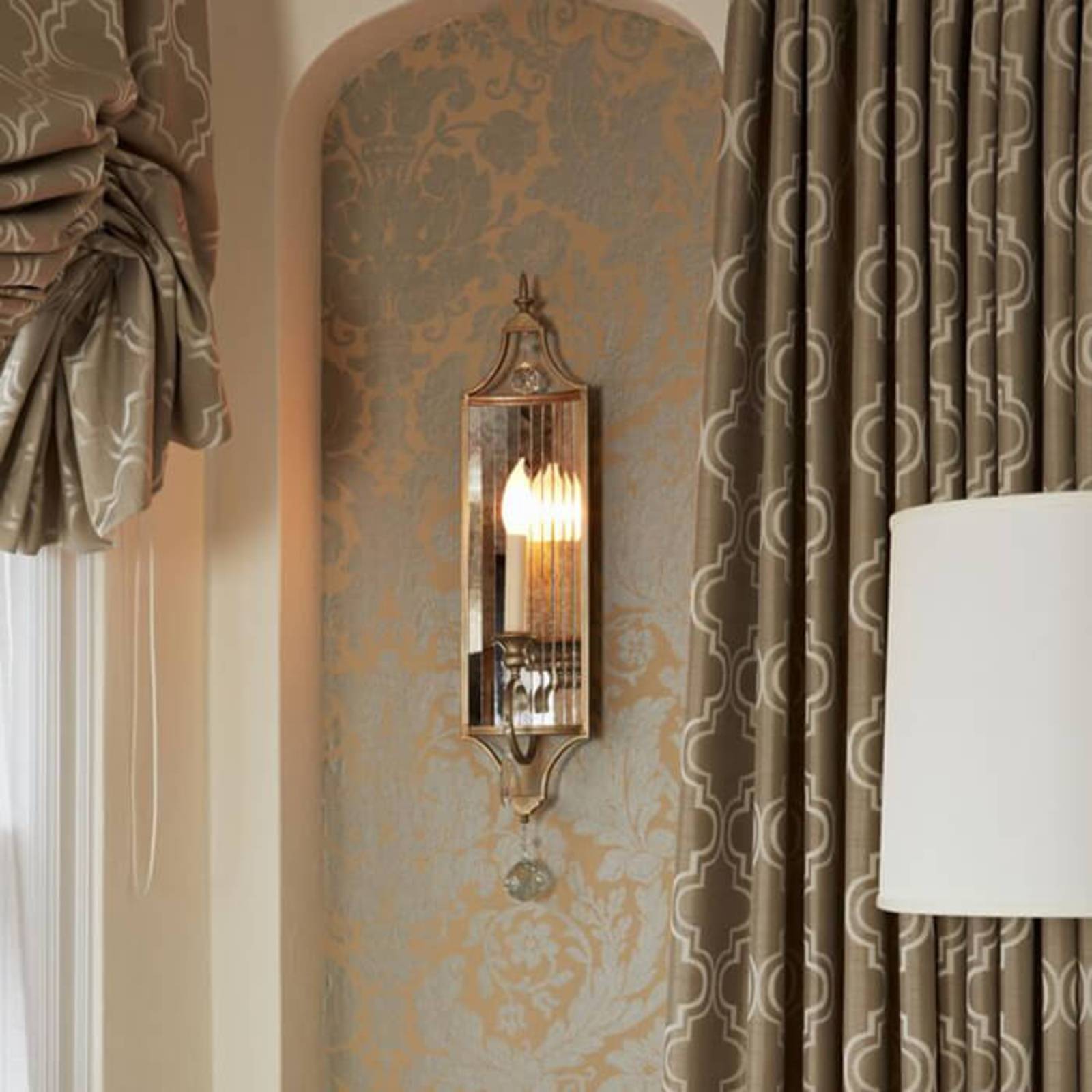 Nástenné svietidlo Gianna so zrkadlovou sklenenou vložkou – 1-pl. lampa Dizajn nástenného svetla Gianna je inšpirovaný elegantnými talianskymi svetlami 20. rokov 20. storočia: Jednoplameňový prídavný dávkovač svetla sa skladá z kovového rámu so zlatou pozlátenou povrchovou úpravou, do ktorého je zakomponovaná zrkadlová sklenená doska , v ktorom sa svetlo sviečky odráža mnohými spôsobmi. Krištáľové vešiaky rôznych veľkostí a tvarov dotvárajú elegantný vzhľad nástenného svietidla Gianna.