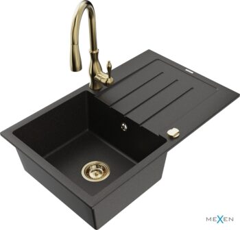 MEXEN/S MEXEN/S – Bruno granitový drez 1 s odkvapkávačom vrátane batérie Savita, čierna/zloty metalik 6513-75-672601-70-B